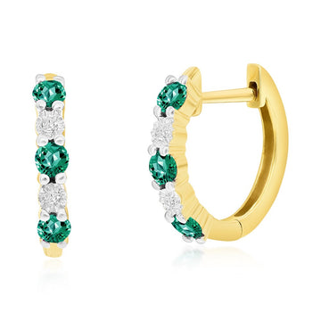 14K Yellow Gold, Round 0.34ct Emerald, Diamond Hoop Earrings - (10 Stones)