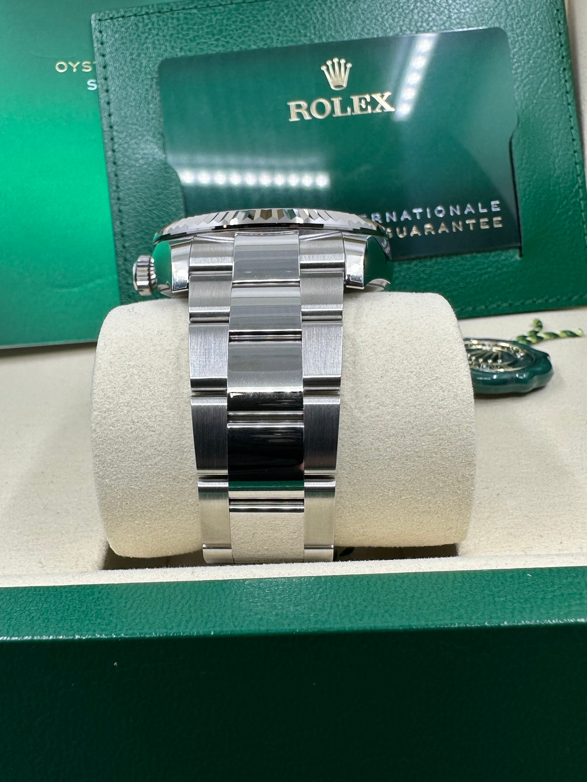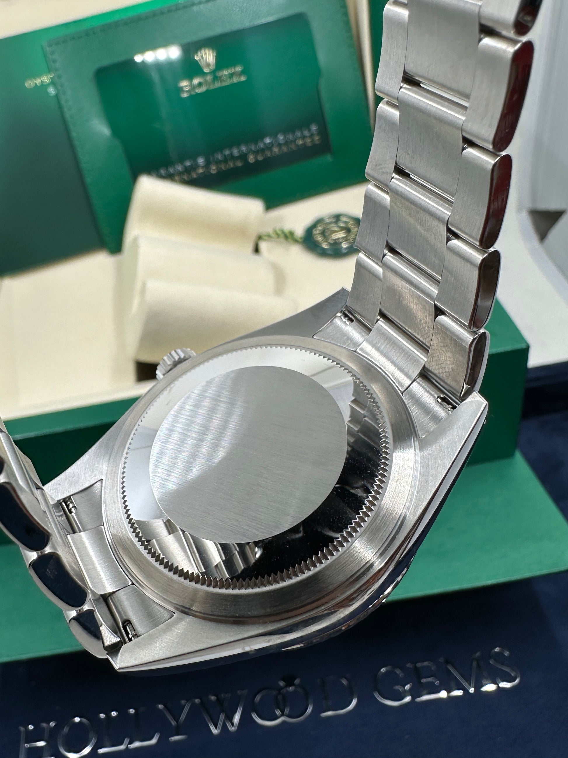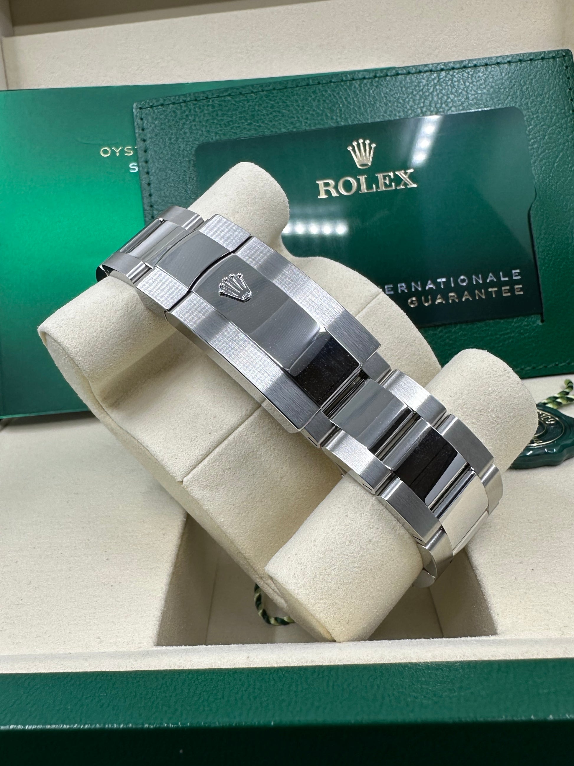 Crafted meticulously by Rolex's artisans, the stainless steel Oyster case and bracelet boast enduring strength and a timeless aesthetic. The hallmark Oyster architecture guarantees exceptional durability while maintaining a refined presence on the wrist.