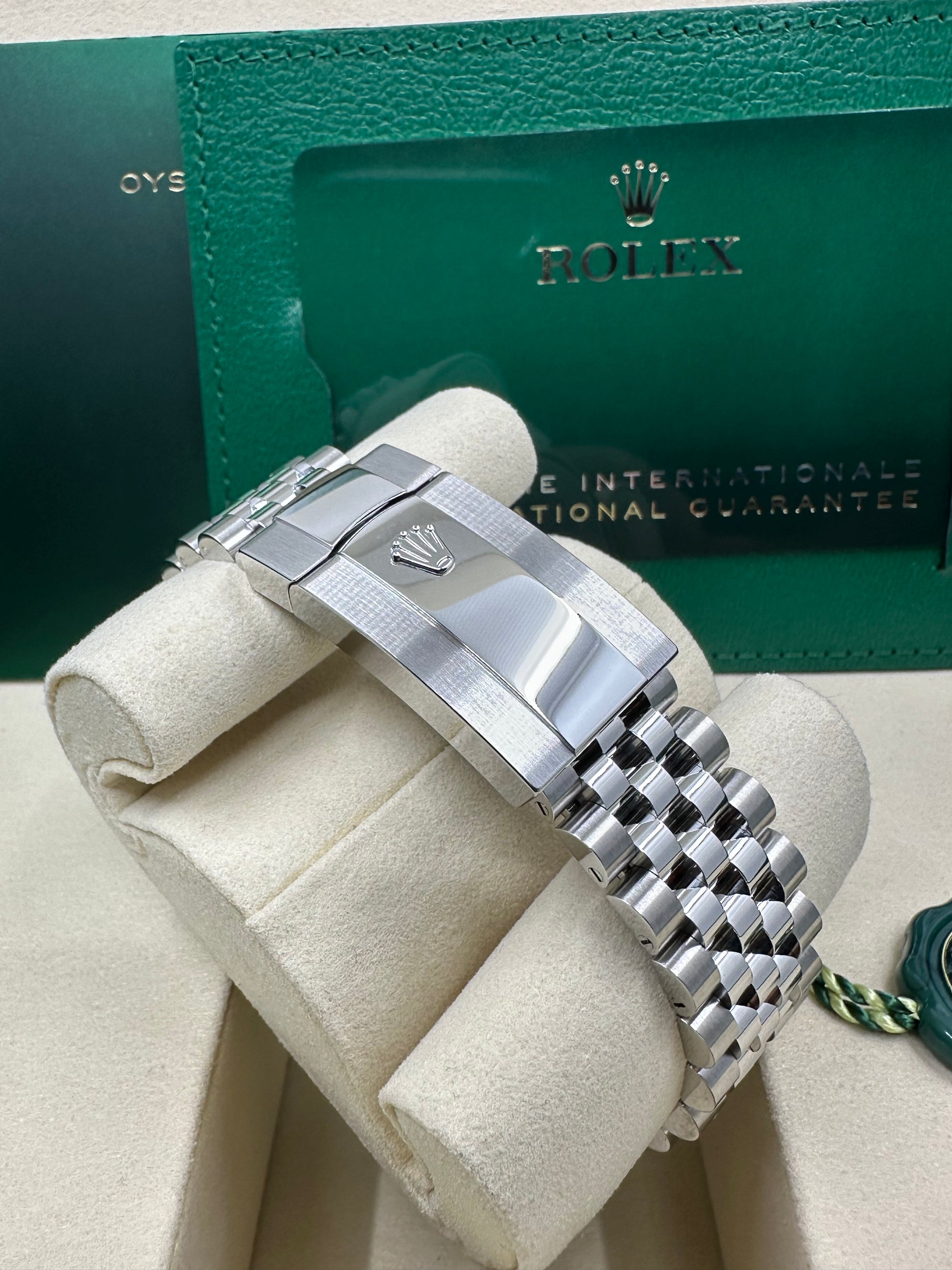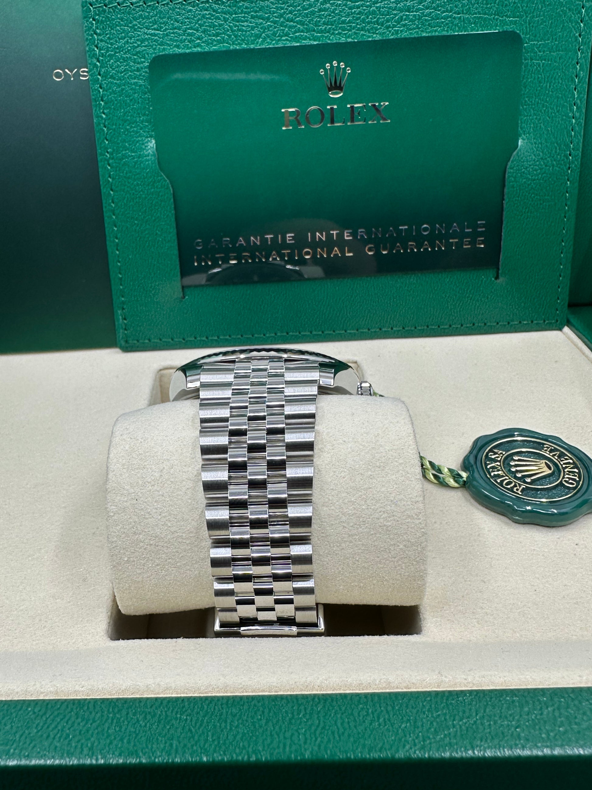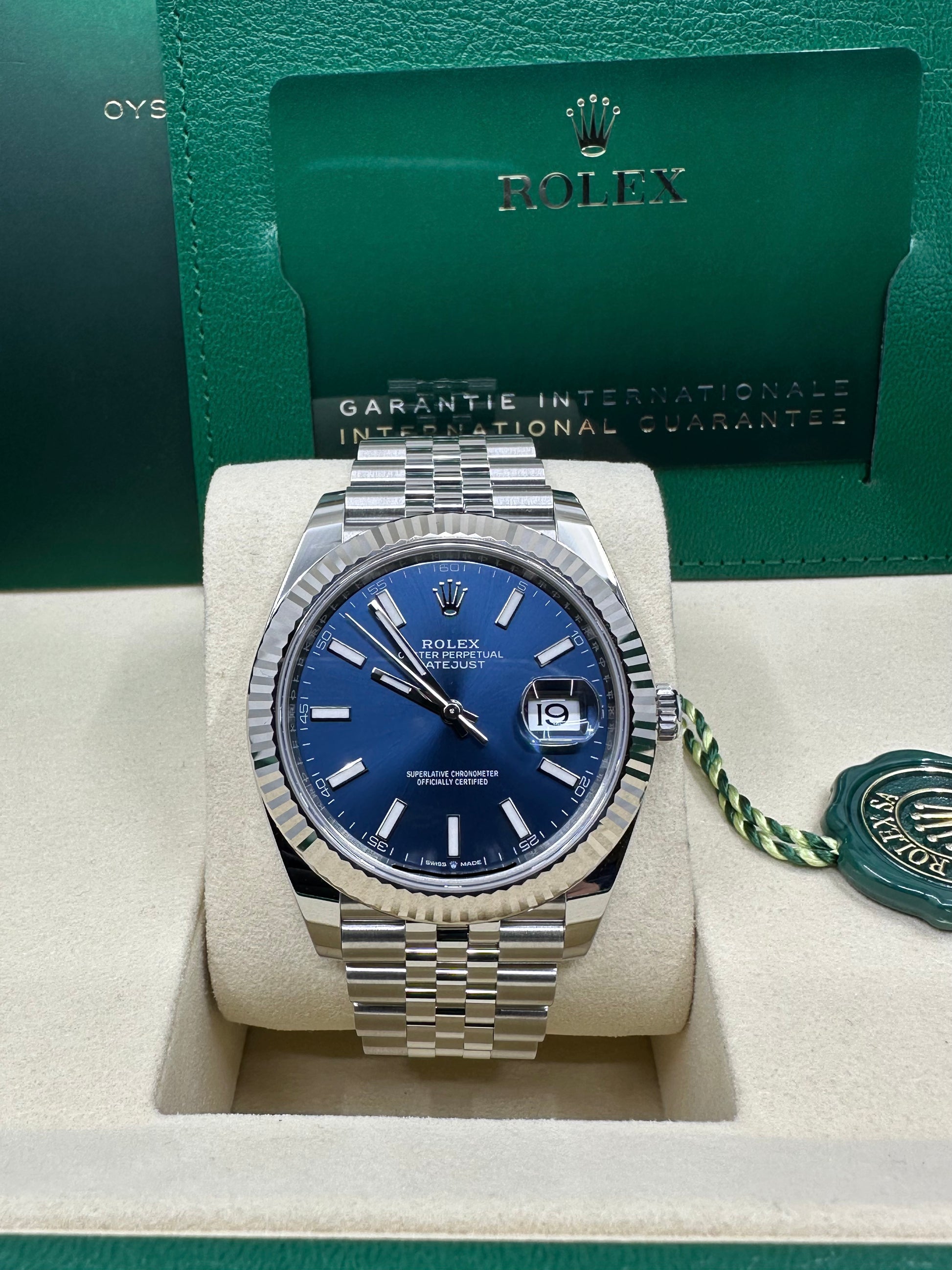 41mm white Rolesor case comprised of a 904L steel monobloc middle case, screw-down steel back, screw-down crown with twinlock double waterproofness system, 18K white gold fluted bezel, scratch-resistant double anti-reflective sapphire crystal with cyclops lens over the date, blue dial, index hour markers, Rolex calibre 3235 perpetual self-winding movement with date at 3 o'clock that changes instantaneously at midnight in a few thousandths of a second, approximately 70 hours of power reserve, 904L steel Jubilee bracelet with five-piece links, folding Oysterclasp buckle with Easylink 5mm comfort extension link. Waterproof to 100 meters.