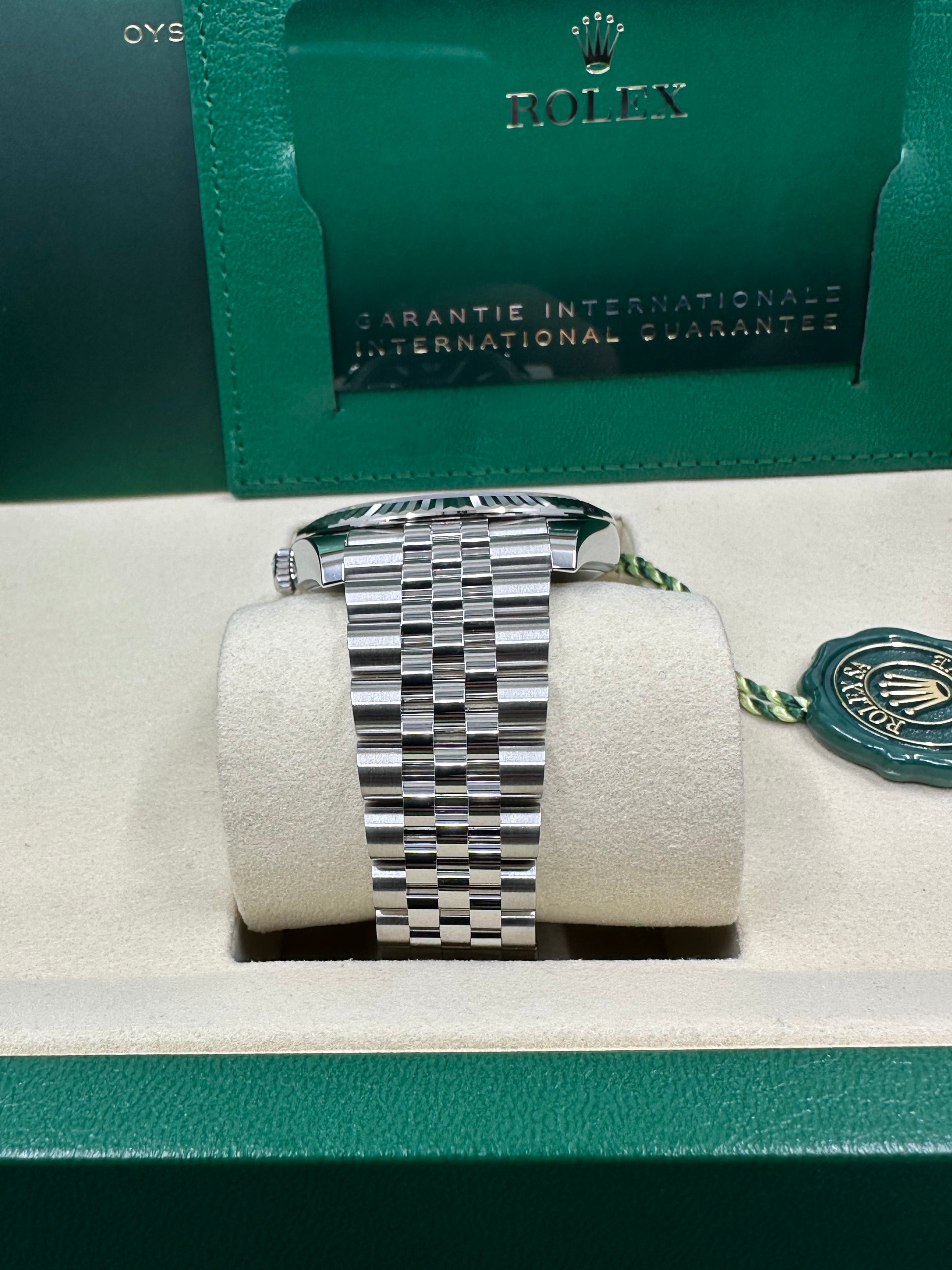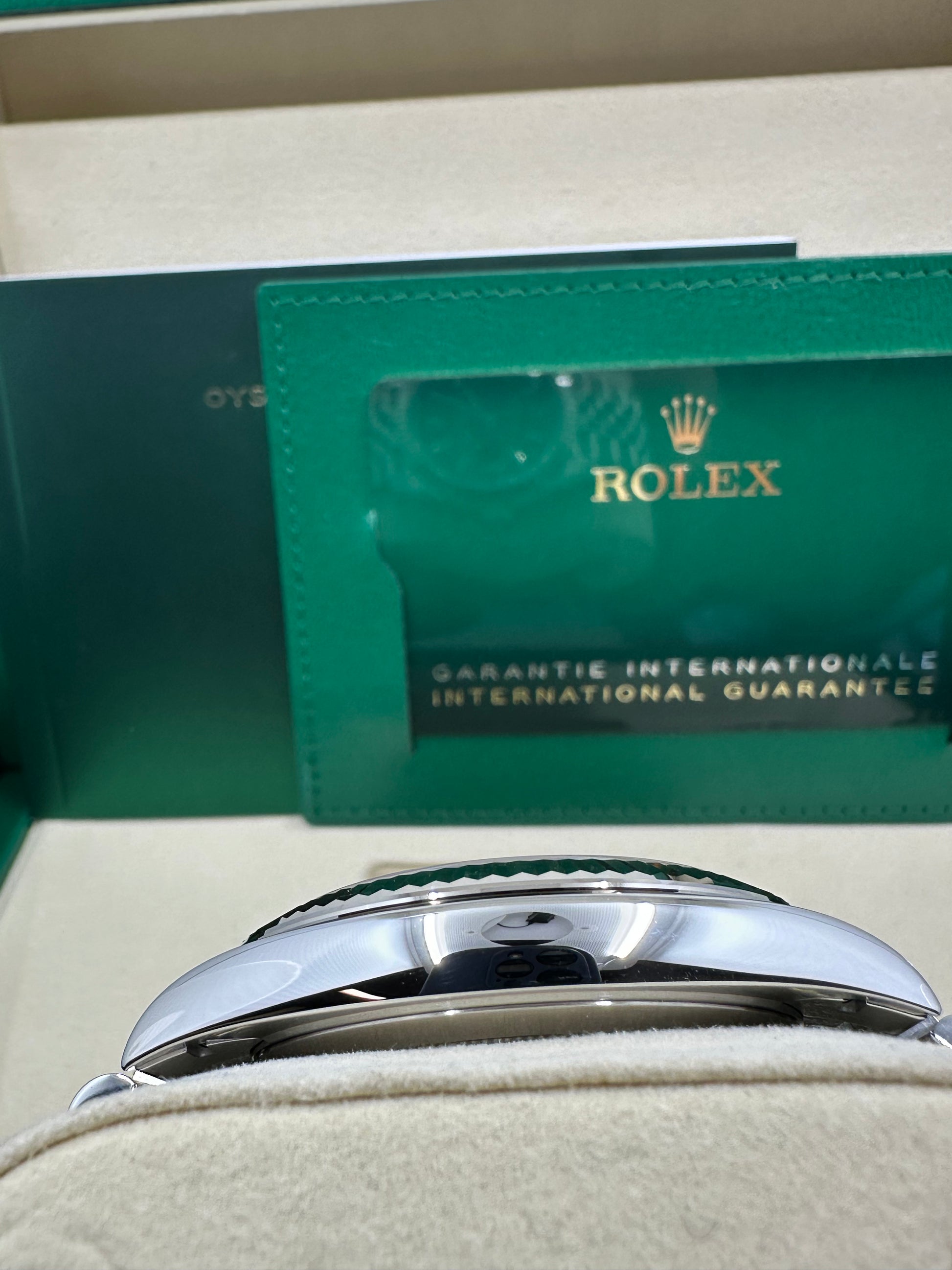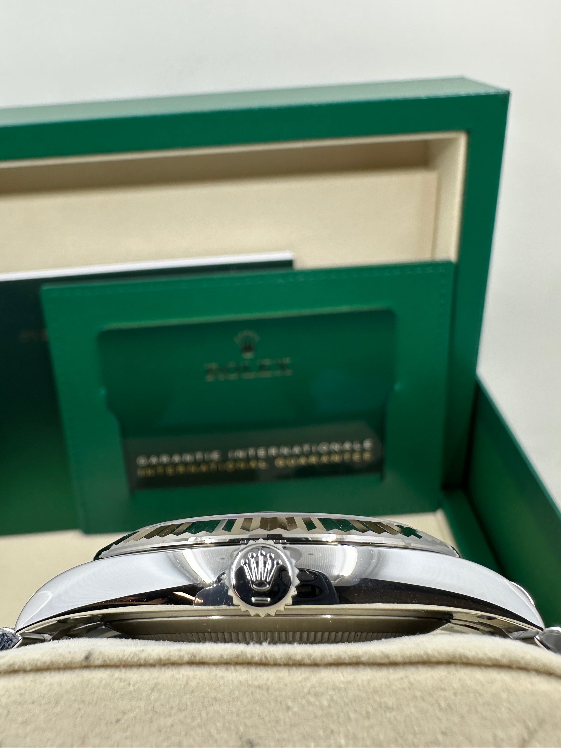 41mm white Rolesor case comprised of a 904L steel monobloc middle case, screw-down steel back, screw-down crown with twinlock double waterproofness system, 18K white gold fluted bezel, scratch-resistant double anti-reflective sapphire crystal with cyclops lens over the date, blue dial, index hour markers, Rolex calibre 3235 perpetual self-winding movement with date at 3 o'clock that changes instantaneously at midnight in a few thousandths of a second, approximately 70 hours of power reserve, 904L steel Jubilee bracelet with five-piece links, folding Oysterclasp buckle with Easylink 5mm comfort extension link. Waterproof to 100 meters.