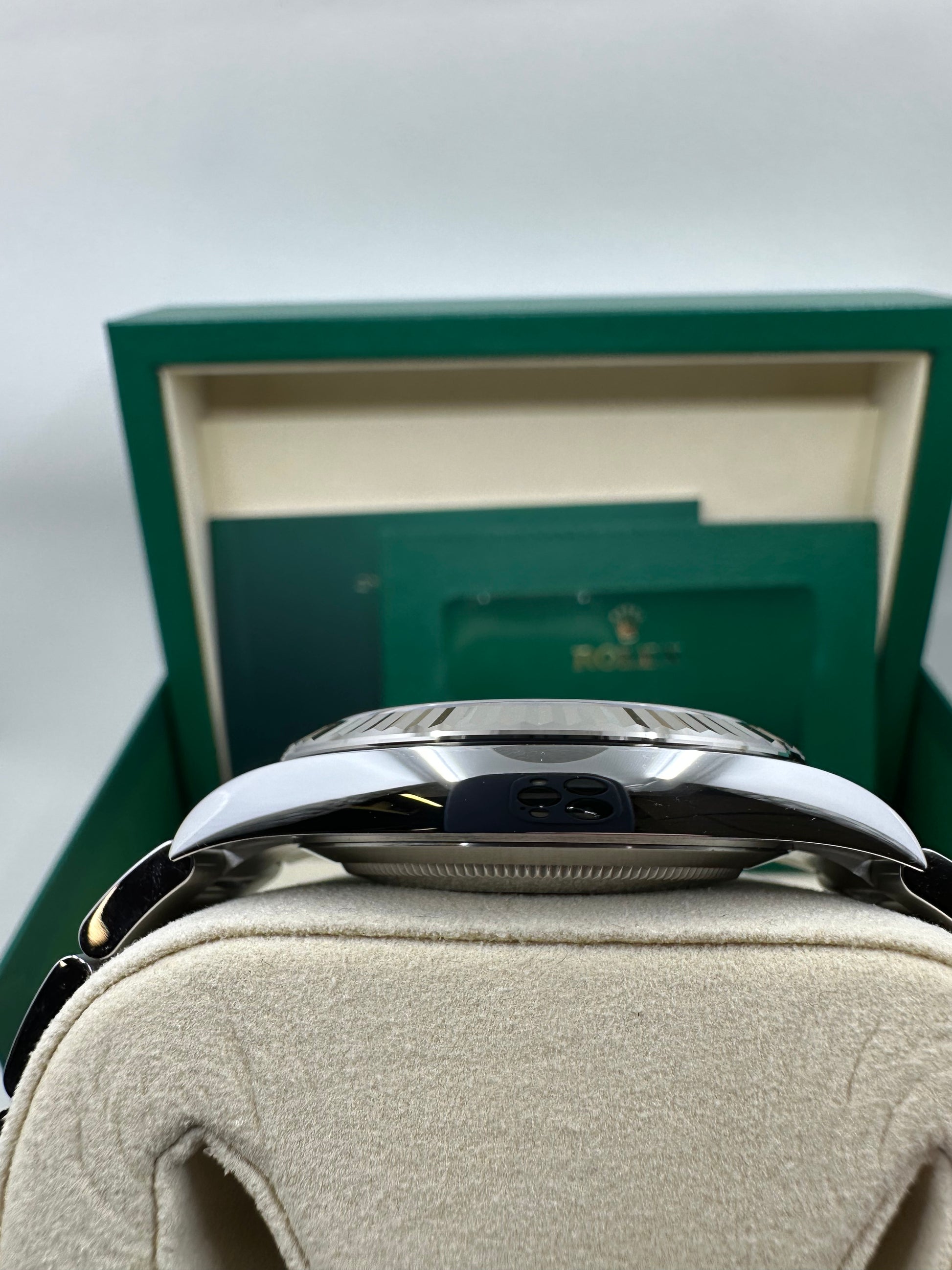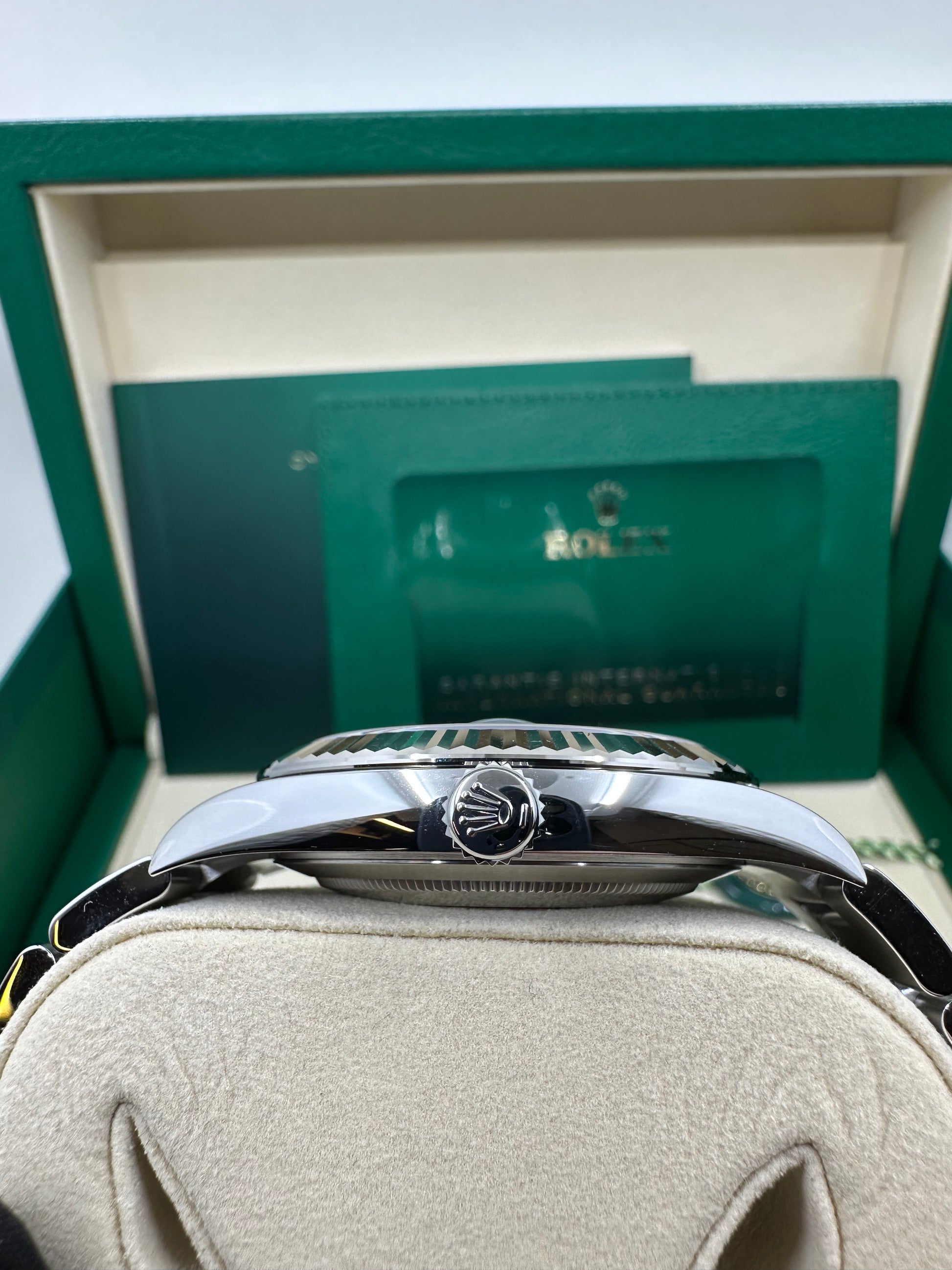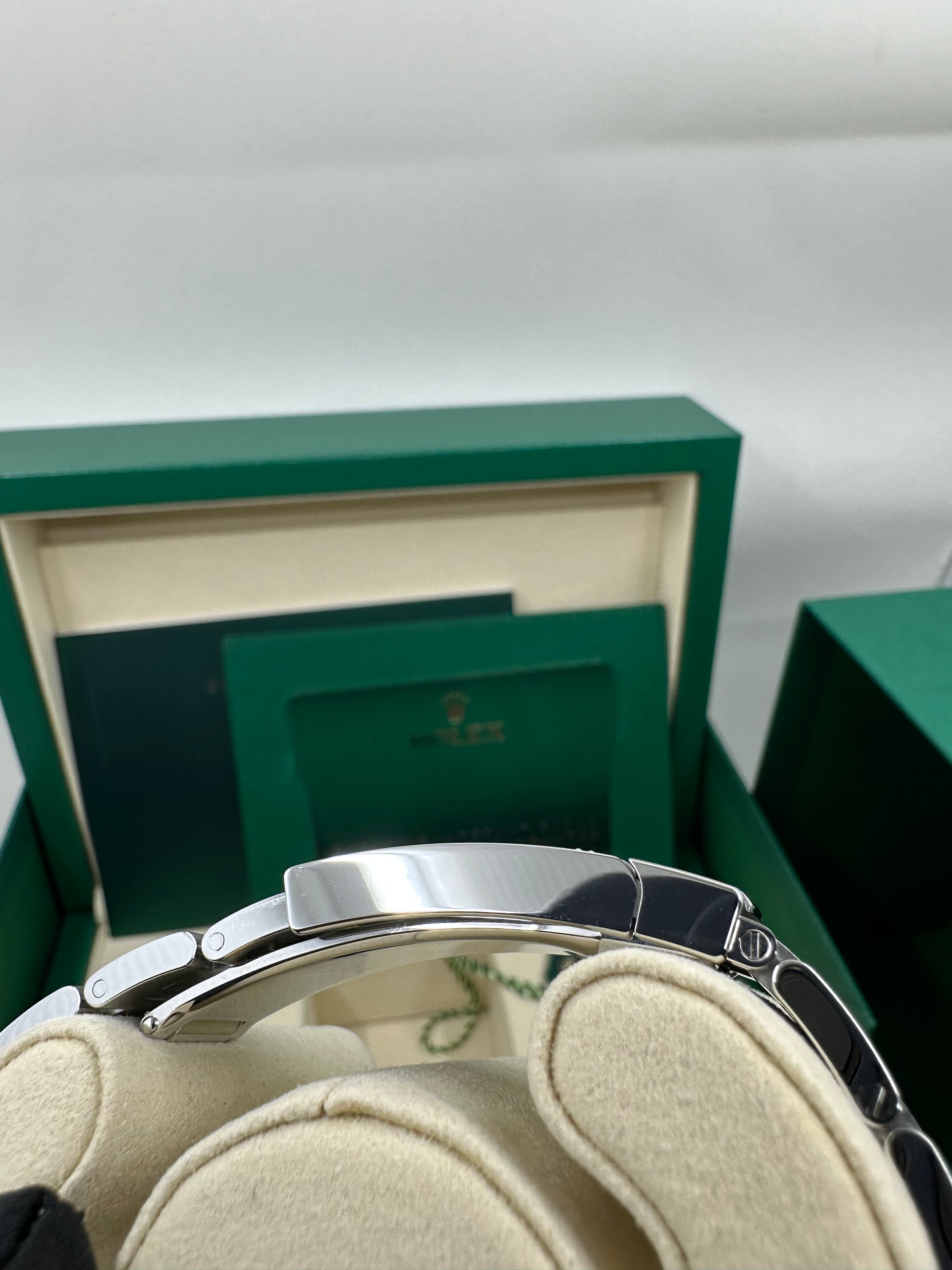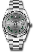 41mm white Rolesor case comprised of a 904L steel monobloc middle case, screw-down steel back, screw-down crown with twinlock double waterproofness system, 18K white gold fluted bezel, scratch-resistant double anti-reflective sapphire crystal with cyclops lens over the date, slate dial, green Roman numerals, Rolex calibre 3235 perpetual self-winding movement with date at 3 o'clock that changes instantaneously at midnight in a few thousandths of a second, approximately 70 hours of power reserve, 904L steel Oyster bracelet with flat three-piece links, folding Oysterclasp buckle with Easylink 5mm comfort extension link. Waterproof to 100 meters.