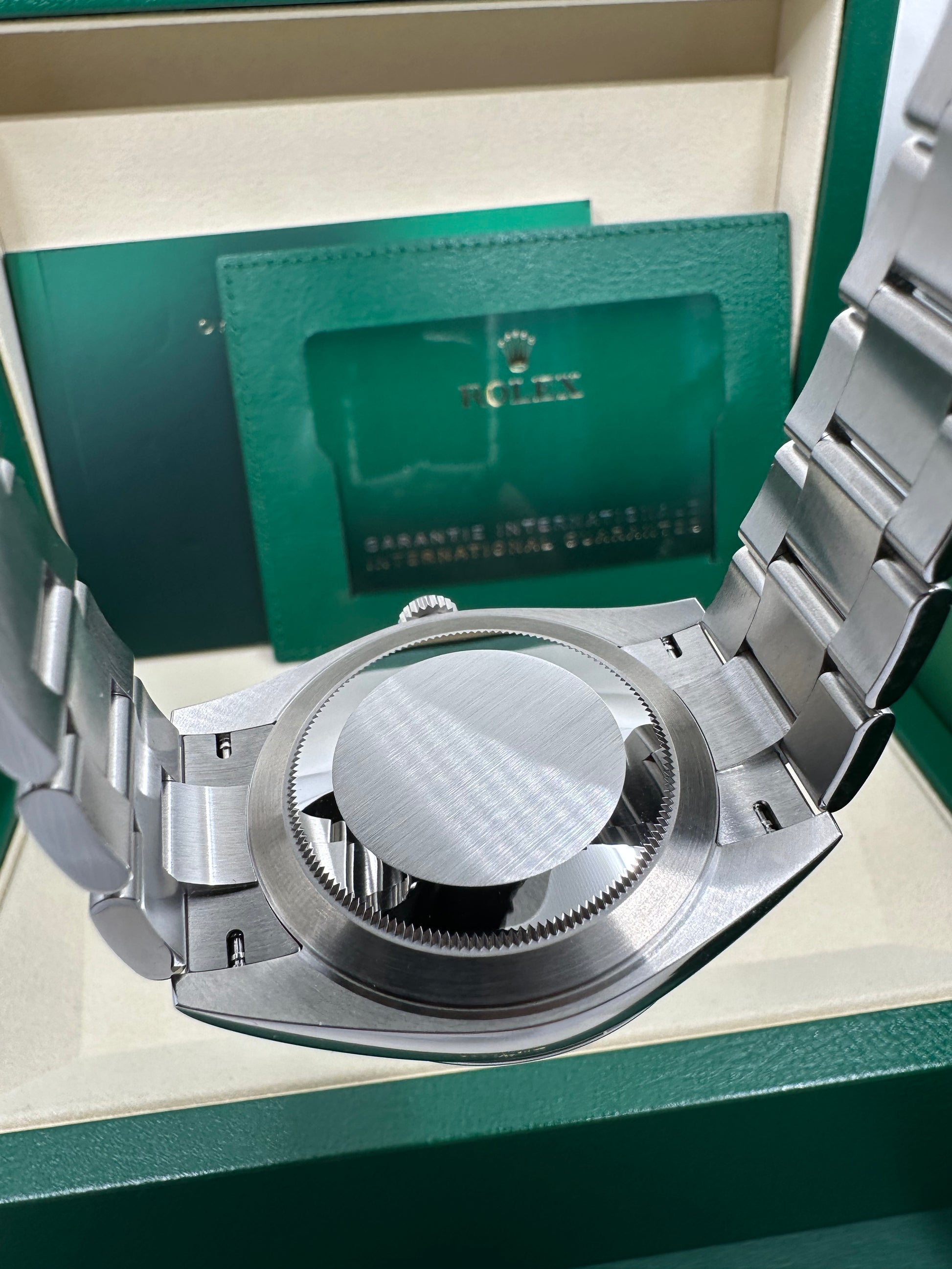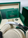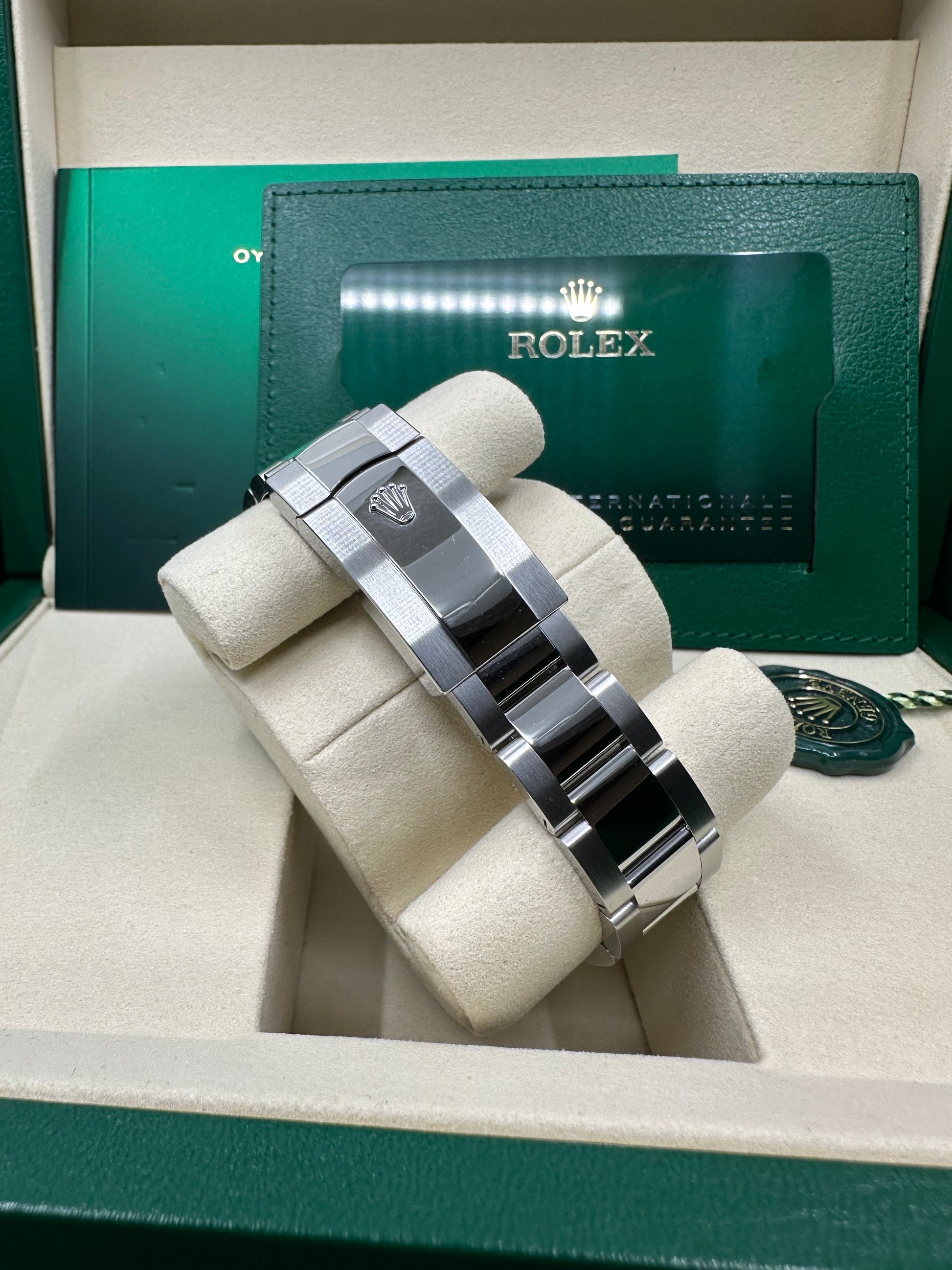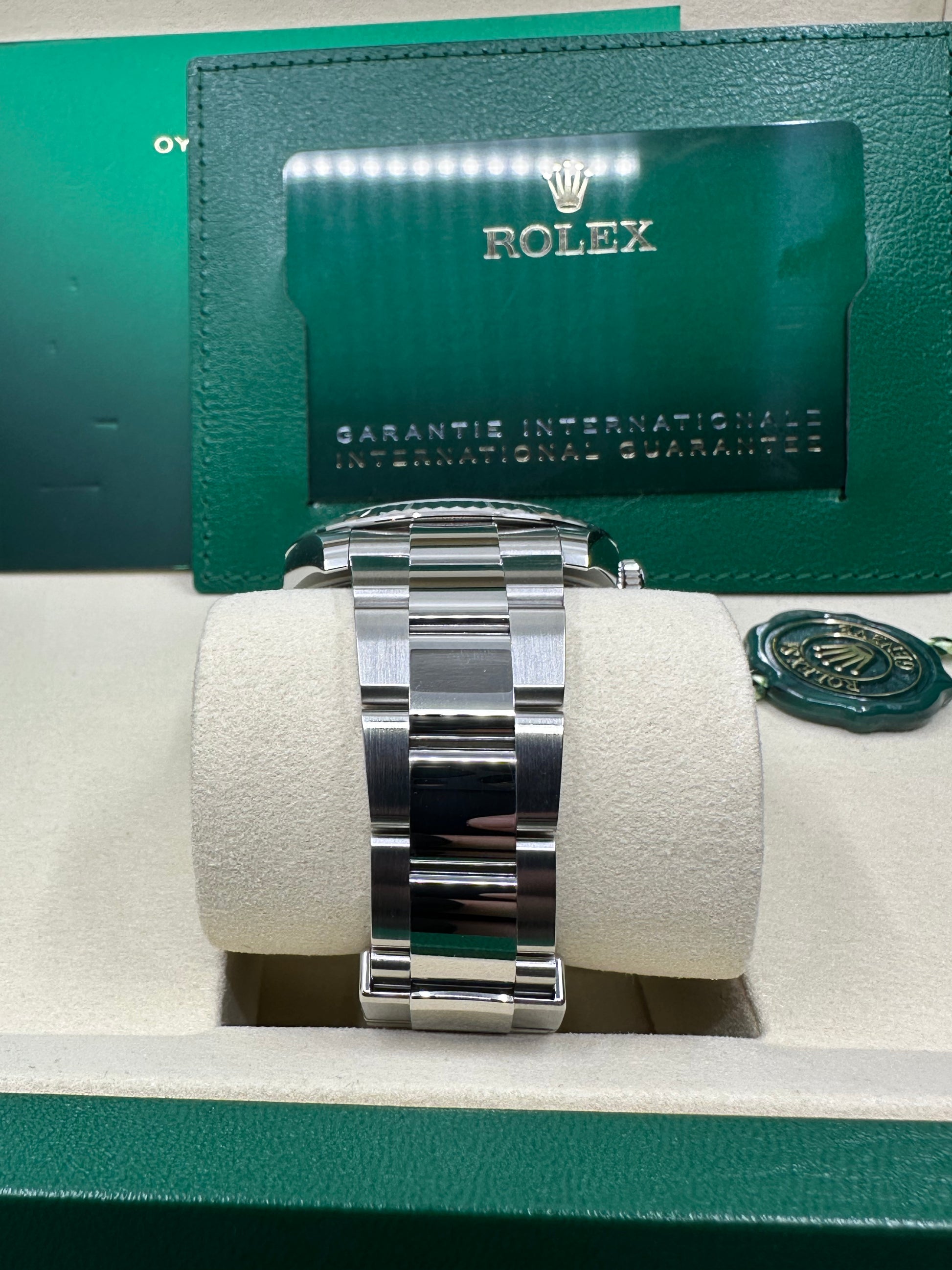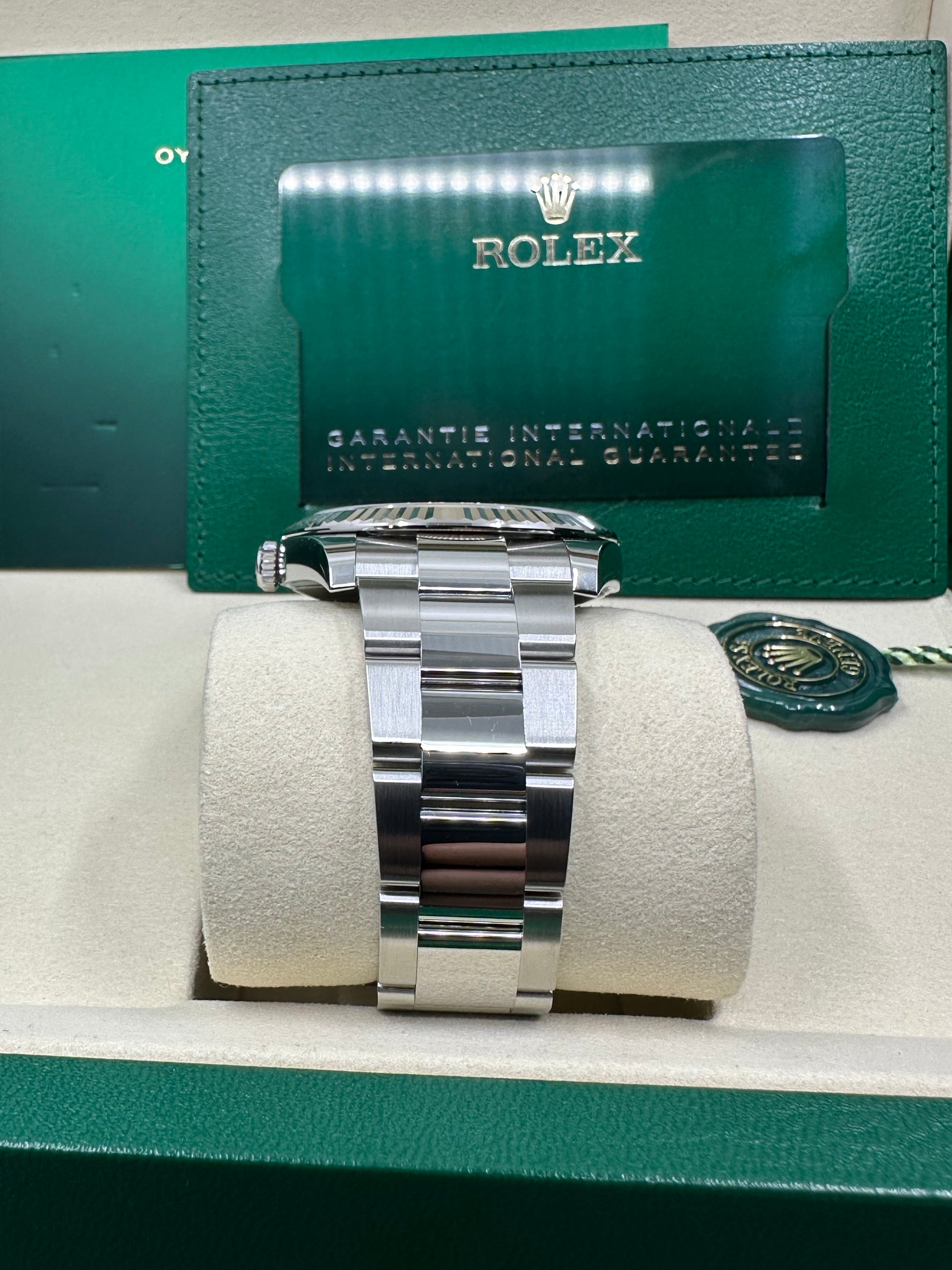 41mm white Rolesor case comprised of a 904L steel monobloc middle case, screw-down steel back, screw-down crown with twinlock double waterproofness system, 18K white gold fluted bezel, scratch-resistant double anti-reflective sapphire crystal with cyclops lens over the date, slate dial, green Roman numerals, Rolex calibre 3235 perpetual self-winding movement with date at 3 o'clock that changes instantaneously at midnight in a few thousandths of a second, approximately 70 hours of power reserve, 904L steel Oyster bracelet with flat three-piece links, folding Oysterclasp buckle with Easylink 5mm comfort extension link. Waterproof to 100 meters.